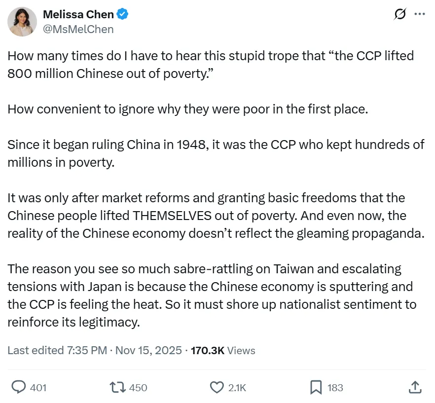 Combien de fois ai-je entendu l’idée stupide que « le PCC a retiré 800 millions de chinois de la pauvreté ». Il est tellement pratique d’ignorer pourquoi ils étaient pauvres. Depuis qu’il a commencé à diriger la Chine en 1948, c’est le PCC qui avait gardé des centaines de millions de chinois dans la pauvreté. C’est seulement après les réformes du marché et l’ouverture des libertés de base que le peuple chinois s’est sorti PAR LUI-MÊME de la pauvreté. Et même maintenant, la réalité de l’économie chinoise n’est pas le reflet de l’intense propagande. La raison pour laquelle on voit tant de disputes au sujet de Taïwan et l’escalade des tensions avec le Japon est parce que l’économie chinoise bafouille et le PCC commence à suer. Il doit donc réveiller le sentiment nationaliste pour renforcer sa légitimité.