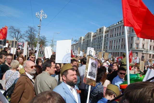 Dès le début de la parade nous avons perdu notre groupe et nous sommes retrouvées toutes deux en compagnie de deux participants du «régiment immortel», Alik et Nikita, deux jeunes Odéssites qui au lieu de marcher tranquillement à l’allure de tous, avaient pris un rythme plus rapide. N’ayant aucun point de rendez vous fixe nous n’avons pas voulu les perdre. Nous avons donc régulièrement dépassé les autres. Nous avons pu ainsi constater que la façon dont les participants à la marche recevaient notre message était bien ce que nous espérions. Nous avons toutes deux été remerciées, photographiées, filmées tout le long de l’après midi. Plusieurs fois des personnes nous ont parlé plus longuement, se sont fait photographier avec nous. La langue utilisée était le plus souvent le français, avec cet accent russe qui, bien entendu, n’était pas l’accent «inimitable» de ma grand mère mais pourtant, en écoutant bien, eh bien si, il y avait aussi de cet accent-là.