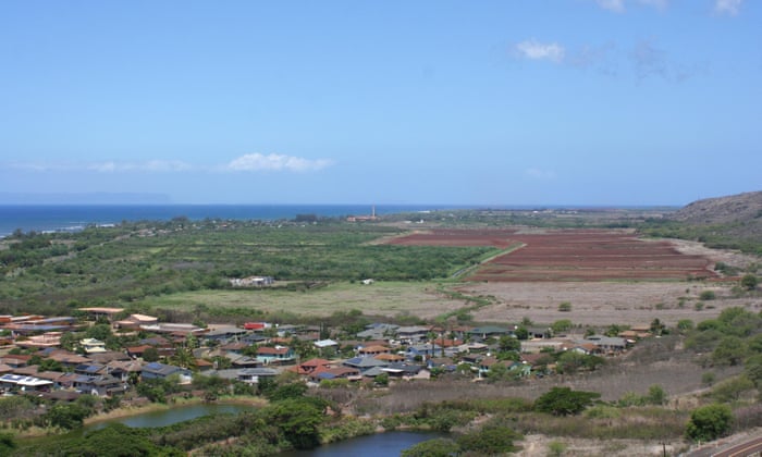 Waimea et les champs OGM. Les deux bâtiments aux toits oranges en bas à gauche sont les Middle School. Celui à sa droite est l’hôpital. Photo: Christopher Pala pour le Guardian