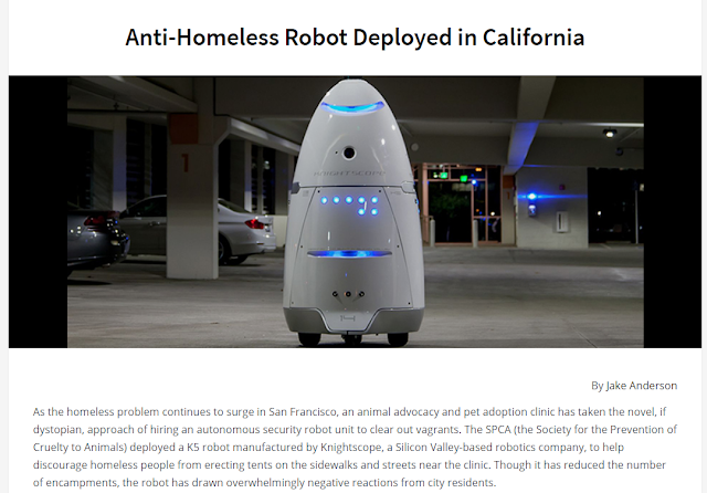 « Alors que le problème des sans-abri continue de s’aggraver à San Francisco, une clinique de défense des animaux et d’adoption d’animaux de compagnie adopte une nouvelle approche, peut-être dystopique, consistant à recruter un robot autonome pour nettoyer les vagabonds. La SPCA (la Société pour la prévention de la cruauté envers les animaux) a déployé un robot K5 fabriqué par Knightscope, une société de robotique basée dans la Silicon Valley, pour décourager les sans-abri d’ériger des tentes sur les trottoirs et les rues proches de la clinique. Bien qu’il ait réduit le nombre de campements, le robot a suscité des réactions extrêmement négatives de la part des habitants de la ville. »