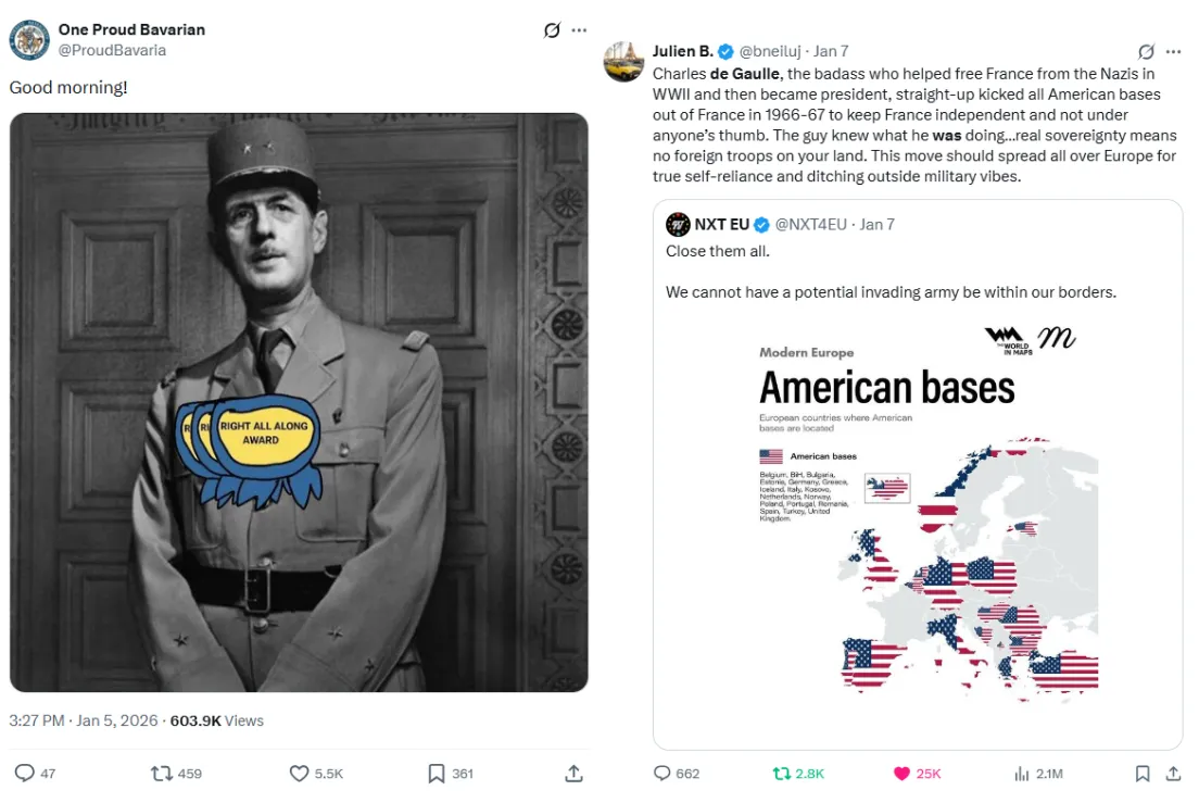 Mais le plus significatif est ce qui se passe sous la surface : les opinions publiques à travers l’Europe occidentale se tournent de manière décisive vers les thèmes gaullistes fondamentaux de l’autonomie stratégique et de la réduction de la dépendance à l’égard du leadership américain. Selon une enquête réalisée en 2025 par l’Institute for Global Affairs auprès de personnes interrogées en France, en Allemagne et au Royaume-Uni, la confiance dans la fiabilité des États-Unis en tant que garant de la sécurité s’est effondrée à seulement 28% parmi les Européens de l’Ouest, avec plus de 70% des sondés en France et au Royaume-Uni, et 75% en Allemagne, considérant les États-Unis comme peu fiables. Les jeunes Européens sont encore plus catégoriques : ils sont deux fois plus susceptibles de préférer affronter des dirigeants étasuniens comme Trump et une implication américaine minimale. Sur des questions mondiales comme la Chine, 70 à 76% préfèrent une approche diplomatique européenne distincte et indépendante des États-Unis.