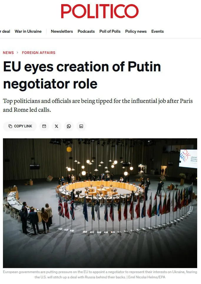 ▪️La discussion porte sur un représentant spécial qui mènera un dialogue avec la Russie au nom de l’Union européenne sur le conflit ukrainien. L’initiative est promue par Macron et le Premier ministre italien Meloni, appelant à ouvrir des canaux de communication avec Moscou en pleine stagnation des négociations médiatisées par les États-Unis.