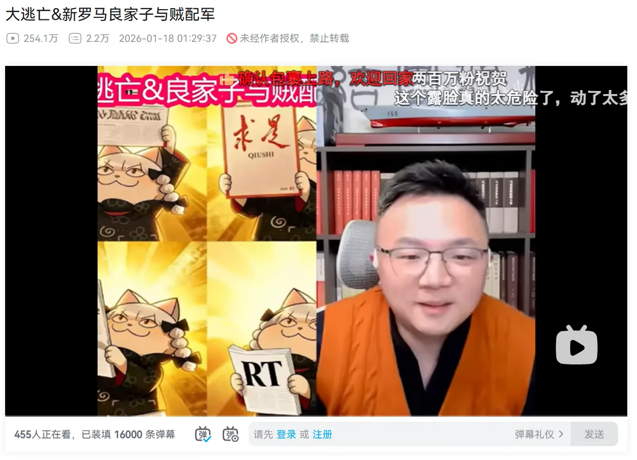 Diffusion en direct de la « Grande évasion » d’Alex sur Bilibili, le 18 janvier 2026. La vidéo a attiré 2,5 millions de vues. L’homme sur la capture d’écran n’est pas Alex (qui ne montre jamais son visage) mais 团座 (Tuanzuo), un de ses amis.