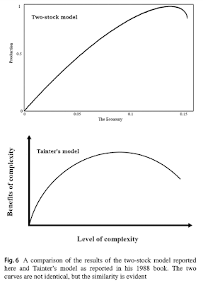 Un problème avec l’idée de Tainter est qu’elle est qualitative : elle est basée sur les données historiques disponibles comme, par exemple, la dévalorisation de la monnaie romaine, mais la courbe des rendements décroissants est juste dessinée à la main. Une question que vous voudrez peut-être poser est la suivante : d’accord, les « rendements décroissants » existent, mais où est l’effondrement dans cette courbe ? Une autre pourrait être la suivante : si le système connaît des « rendements décroissants », pourquoi la courbe ne retrace-t-elle pas simplement une trajectoire pour revenir là où elle était auparavant ?