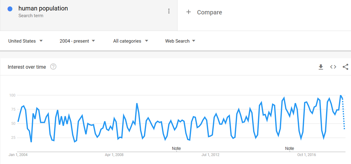 Je lis de plus en plus de commentaires sur la surpopulation dans les médias sociaux. Il ne s’agit pas seulement d’une impression : la tendance à l’intérêt croissant pour les questions de population est visible dans Google Trends. C’est encore faible, mais c’est bien là.