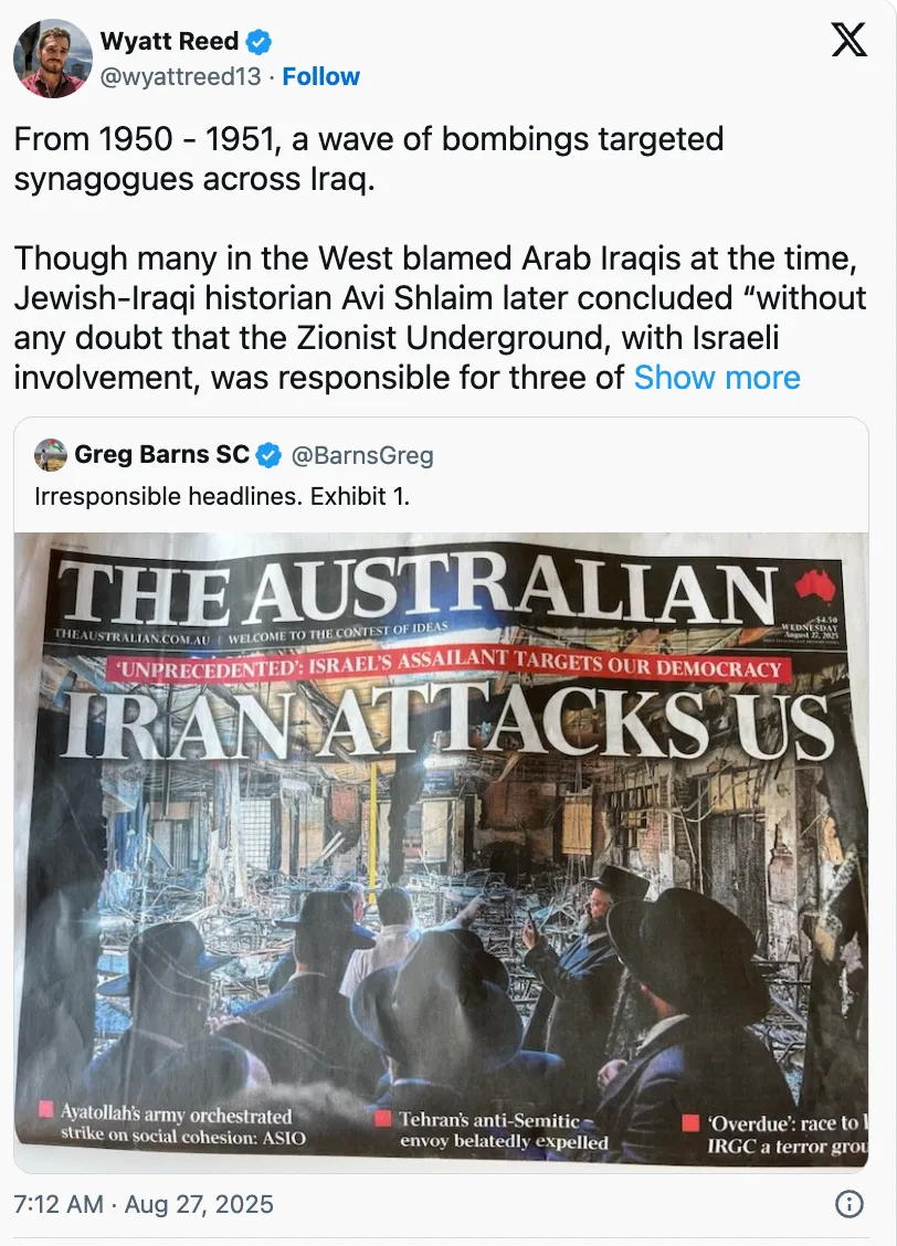 Il est fort possible qu’un plan similaire ait été mis en œuvre en Australie beaucoup plus récemment. Lorsqu’une vague d’attaques contre les communautés juives a rapidement suivi la décision du Premier ministre australien Antony Albanese de reconnaître un État palestinien en 2025, les médias ont immédiatement blâmé l’Iran. Il s’est avéré que cette croyance était également due à l’influence israélienne.
