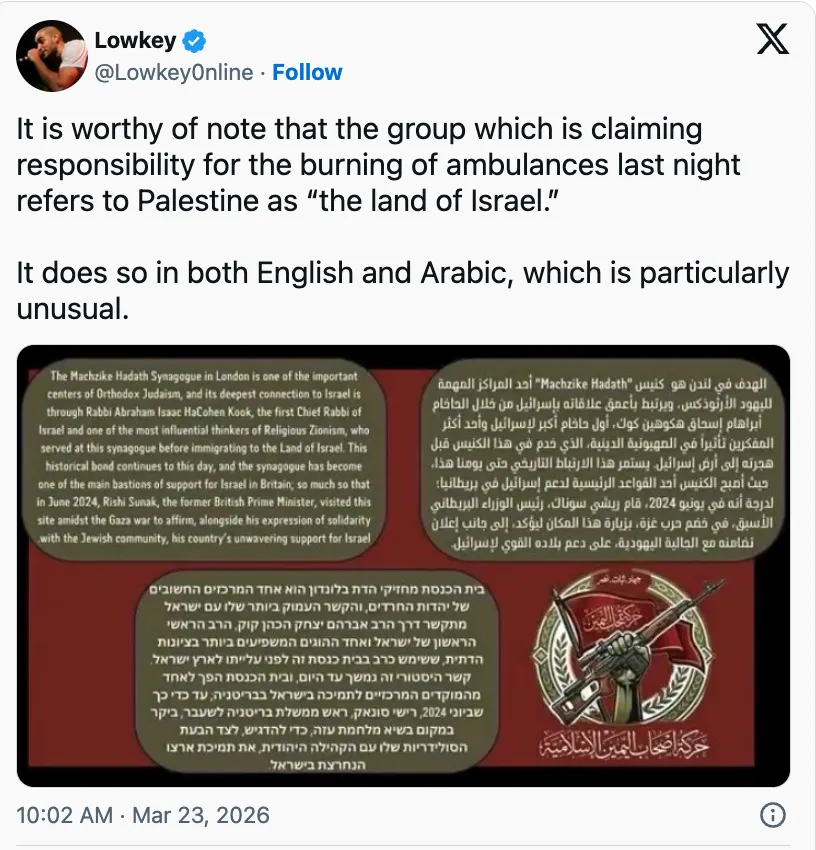 Dans les documents du groupe, le logo change considérablement d’un message à l’autre, suggérant fortement qu’ils ont été créés à la hâte avec une IA. Les communiqués contiennent également un langage très discutable, à commencer par une déclaration du 20 mars qui faisait référence à la « nation d’Israël ». Plusieurs jours plus tard, un message revendiquant le mérite d’avoir incendié des ambulances à Londres faisait référence à quatre reprises en anglais et en arabe à « Israël » ou « la Terre d’Israël ». La traduction hébraïque de la déclaration soulève encore plus de questions, car elle fait référence au déménagement d’un rabbin dans le pays comme “faisant son aliya en Terre d’Israël” – une expression employée exclusivement par les sionistes.